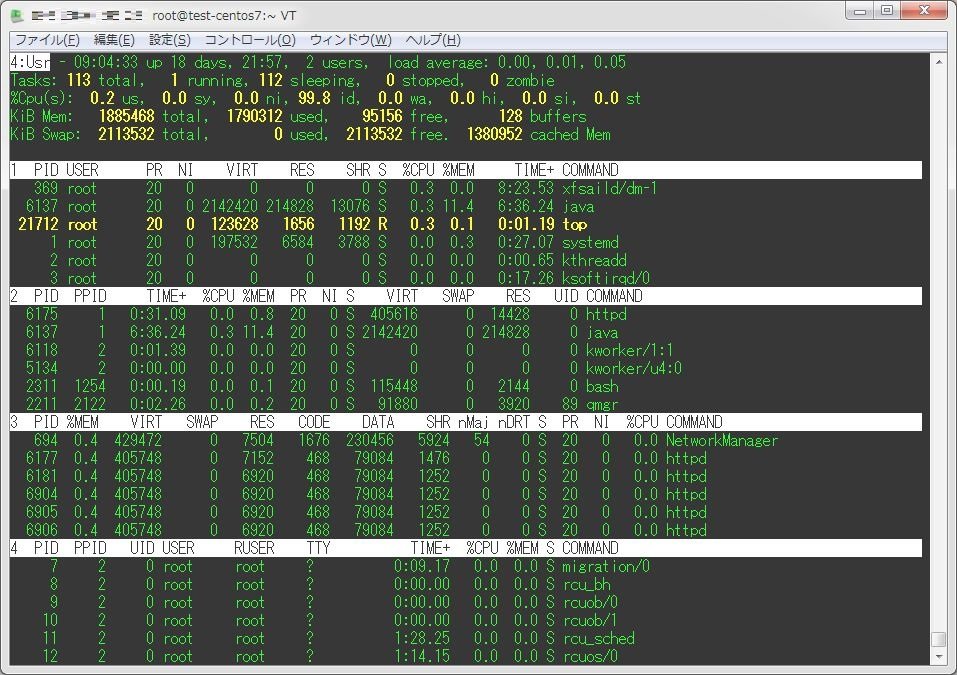 topコマンド実行中に「Shift + A」を押下することで、プロセスの実行ステータスを複数ウィンドウに切り分ける事ができる。