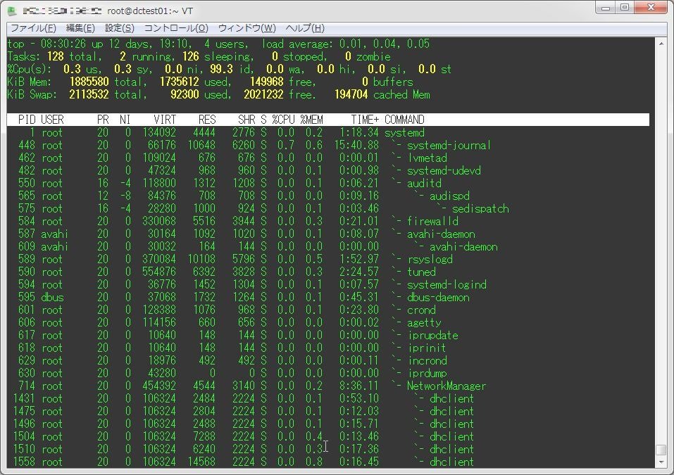 - VIRT … プロセスの仮想メモリーサイズ(スワップアウトしたメモリー使用量を加えたメモリー容量)